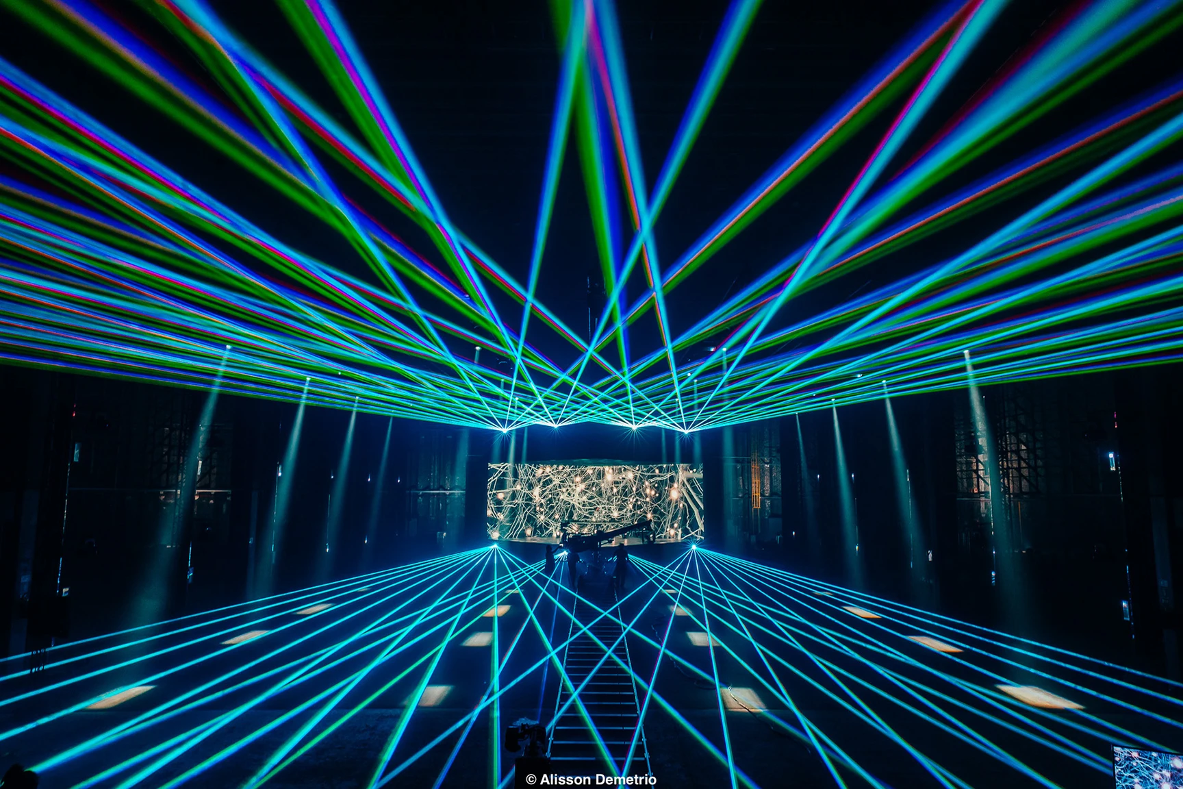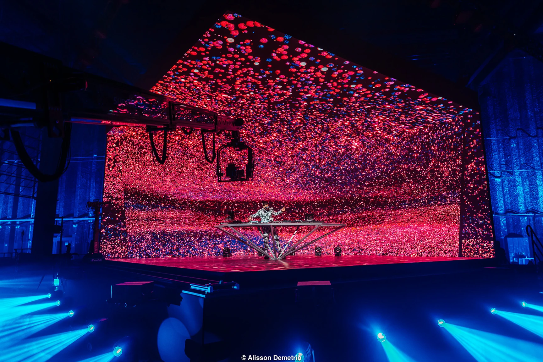 The director's cameras were precisely tracked in real-time, with spatial positioning data sent back to Unity to ensure the visuals on the LED panels displayed the 3D content from the correct angle, creating the illusion of an infinite background for Alok's performance on stage.